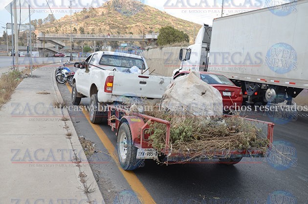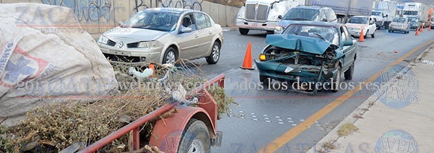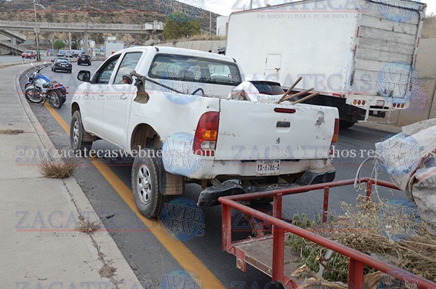 Zacatecas, Zac. Cerca de las 17 horas sobre tránsito pesado con dirección a Guadalupe, Una camioneta Hilux color blanco que jalaba un remolque se paró de manera repentina sobre el carril de alta pues es de un contratista que se dedica a desyerbar la arteria, con tan mala suerte que el conductor de un auto Nissan se impactó contra el remolque en la parte trasera.