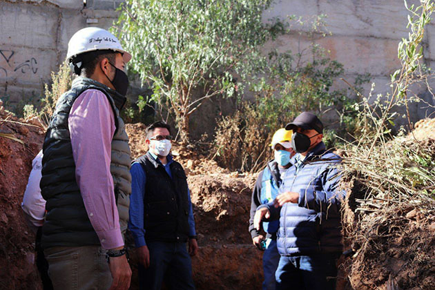 Zacatecas, Zac.– El alcalde capitalino Ulises Mejía Haro realizó un recorrido de supervisión por la calle Clorofila de la colonia El Jaralillo, donde en coordinación con Gobierno del Estado, se realiza actualmente la obra de ampliación de red de drenaje con la colocación y suministro de 130 metros lineales con 6 tomas domiciliarias, la instalación de tubería PVC de 20 pulgadas para mayor calidad y resistencia, así como los 5 pozos de visita para los hogares de dicha calle. “Hasta el momento se tiene un 60 por ciento de avance en los trabajos”, explicó el primer edil, señalando que estas acciones se suman la ampliación de red eléctrica, alumbrado público, limpieza y dignificación de la avenida Sierra Madre en este polígono.