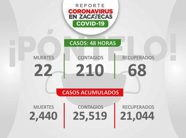 Al día 326 de la pandemia, en Zacatecas se han realizado 48 mil 498 pruebas, de las que 25 mil 519 han sido positivas, 22 mil 705 negativas y 274 están pendientes. Ha habido 2 mil 440 fallecimientos, se han recuperado 21 mil 044 pacientes y hay 2 mil 035 casos activos.