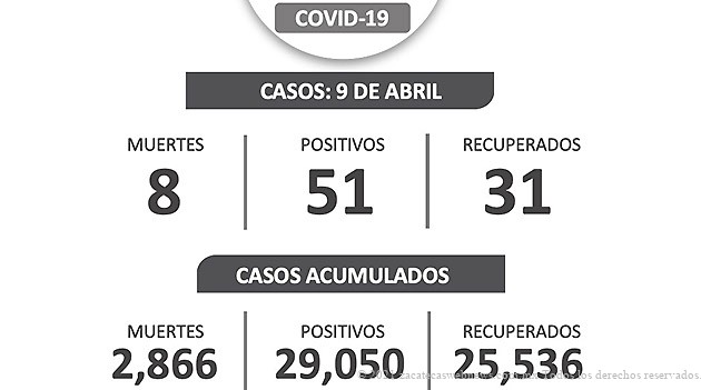 Zacatecas, Zac.- Zacatecas cerró la semana con 51 nuevos casos de COVID-19, con lo cual el acumulado es de 29 mil 050 en toda la entidad. Este día, además, el reporte de la Secretaría de Salud de Zacatecas (SSZ) incluye a ocho muertes por la enfermedad y 31 personas que la superaron.