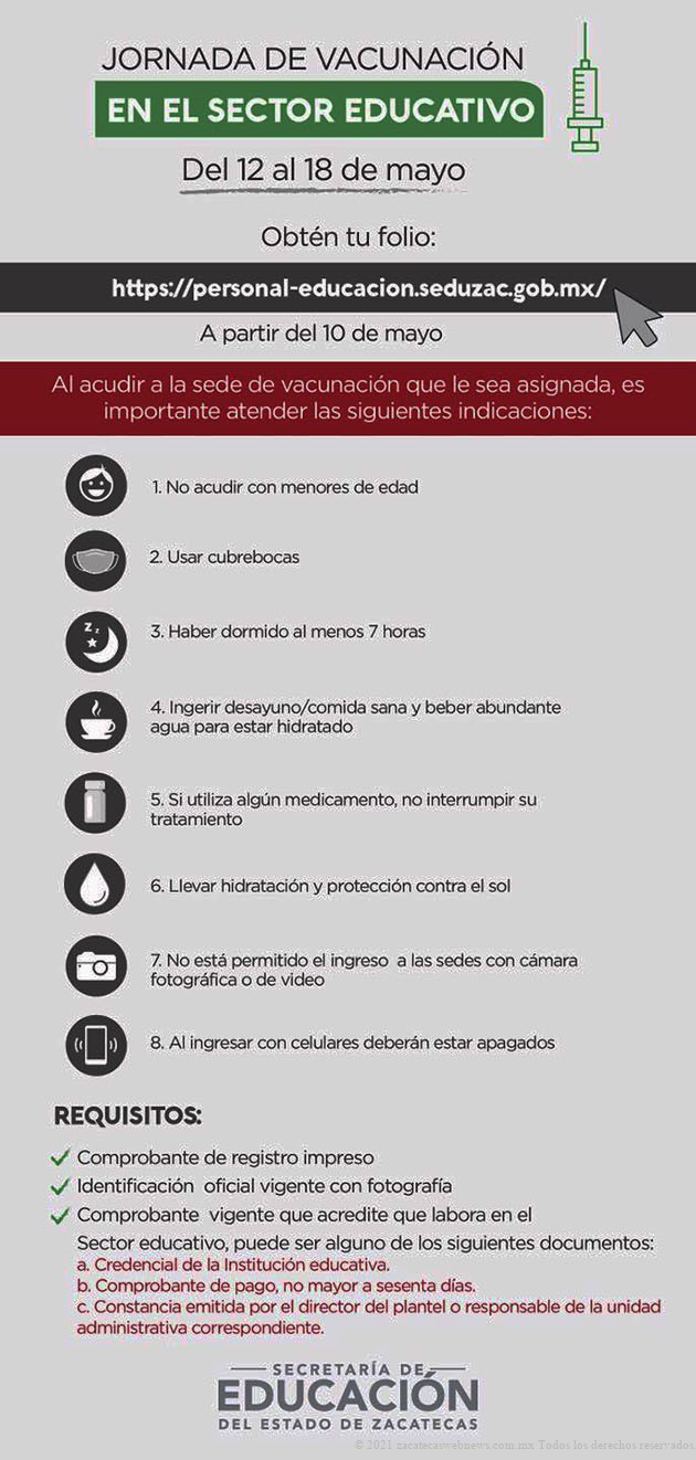PROCESO DE VACUNACIÓN EN EL SECTOR EDUCATIVO EN ZACATECAS SERÁ DEL 12 AL 18 DE MAYO
