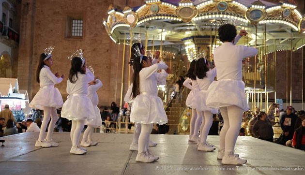 Zacatecas, Zac.- Niñas y niños de la Casa Cuna “Plácido Domingo” encantaron al público zacatecano con su talento al presentar números artísticos de Navidad en la Plaza de Armas, como parte del Festival de Luces de Zacatecas.