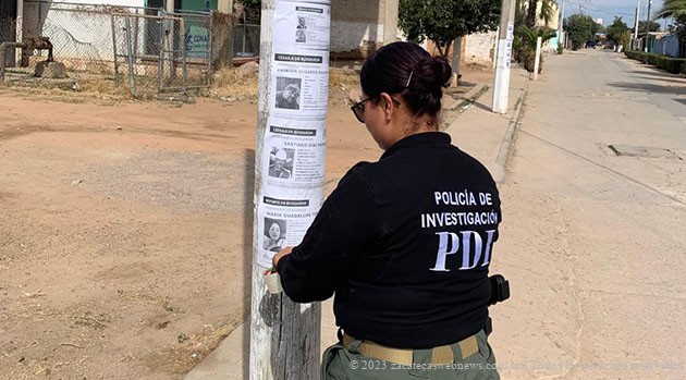 De la misma forma se realizó acciones de búsqueda y prospección terrestre, así como la pega de cédulas en la comunidad de La Concha, municipio de Ojocaliente y en el predio La Congoja, ubicado en la zona del Rancho Sandra, en el municipio de Cuauhtémoc, Zacatecas, sin hallazgos positivos.
