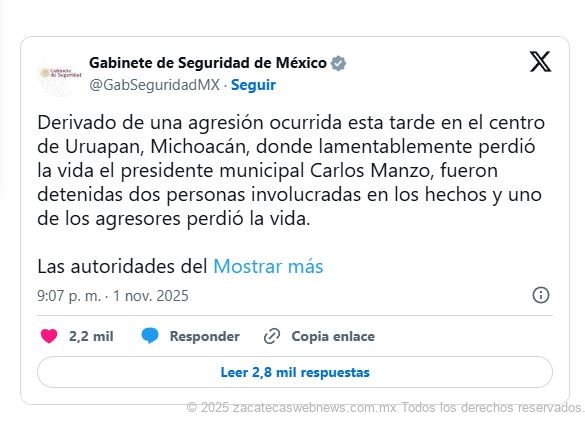 Los primeros informes por parte de las autoridades comentan que Manzo fue agredido con disparos de arma de fuego por sujetos armados. Autoridades en el lugar lograron detener a dos agresores mientras otro perdió la vida; un escolta de Carlos Manzo, resultó lesionado.