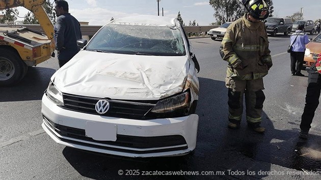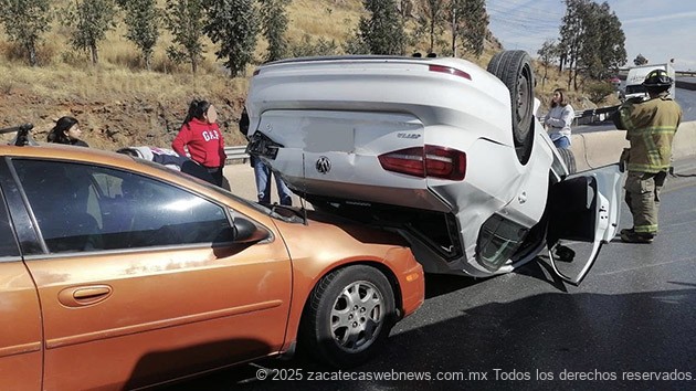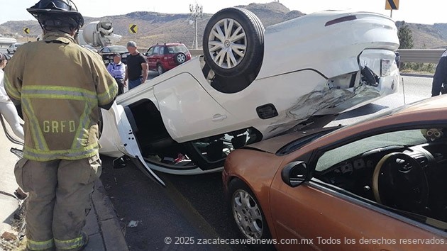 Zacatecas, Zac.- Personal de Protección Civil Estatal atendió un accidente vehicular múltiple con volcadura registrado en el libramiento de tránsito pesado, en el que se vieron involucrados tres vehículos, uno de ellos volcado.