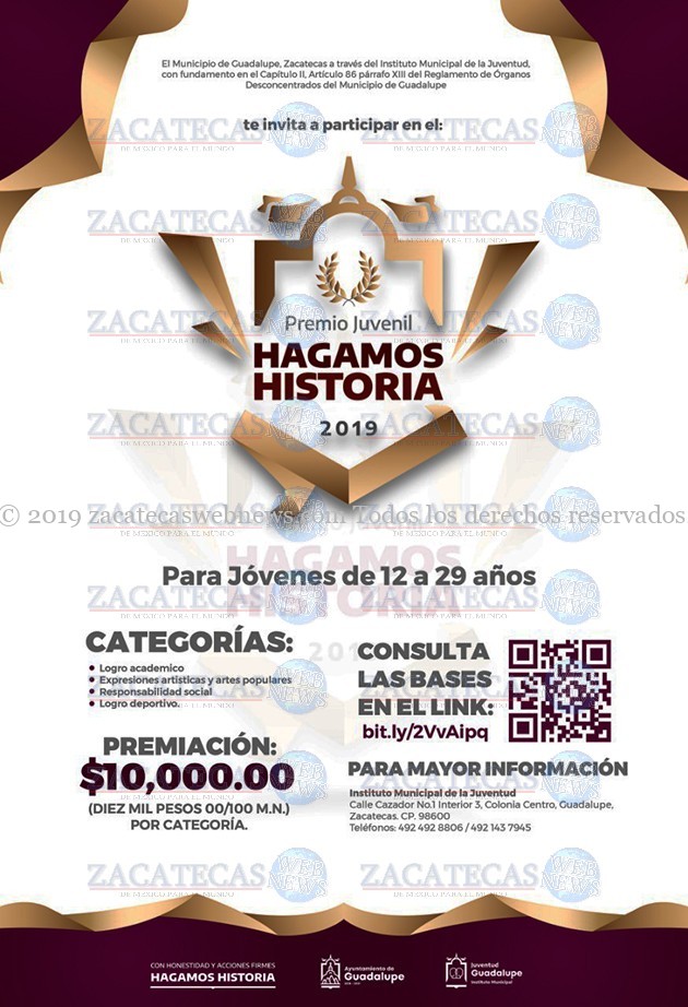 Guadalupe, Zac.- El Ayuntamiento de Guadalupe, que preside Julio César Chávez Padilla, a través del Instituto Municipal de la Juventud, convoca a todos los jóvenes guadalupenses de 12 a 29 años de edad, a que participen en el Premio Juvenil Hagamos Historia 2019, donde habrá una bolsa económica de 40 mil pesos a repartirse en cuatro categorías: logro académico, expresiones artísticas y artes populares, responsabilidad social y logro deportivo; la convocatoria se cierra el 8 de noviembre.
