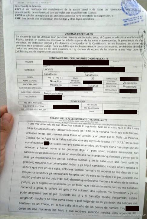 En un domicilio ubicado en la calle La Palabra hay dos perros de la raza Pi Bull que regularmente están atados con una cadena. Desafortunadamente ese día, los dos canes no estaban sujetos y sin más, atacaron a su víctima mordiéndole uno de ellos, la parte del el músculo gastrocnemio (chamorro) causándole severos daños.