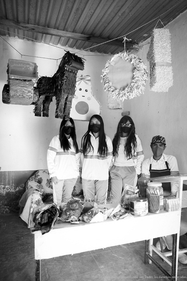 El papá de un alumno prestó dos cuartos que tiene en la comunidad y éstos fueron habilitados como taller; además, como punto de venta. En su interior, cuelgan piñatas de un aguacate, de personajes de caricaturas, de cajetillas de cigarros, de figuras navideñas, etcétera; cualquier diseño lo hacen los estudiantes.