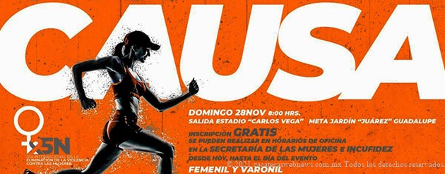 Zacatecas, Zac.- En seguimiento a las acciones realizadas por la nueva gobernanza para combatir la violencia contra las mujeres, contribuir al bienestar y a la reconstrucción del tejido social, el próximo 28 de noviembre se llevará a cabo la Carrera Atlética 5K Con Causa 25N, la cual iniciará en el estadio Carlos Vega Villalba y concluirá en el Jardín Juárez de Guadalupe.
