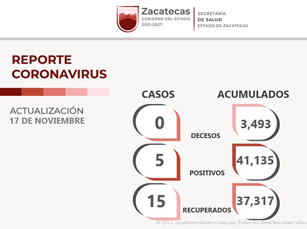 Cuatro casos fueron registrados como contagios comunitarios y uno por haber tenido contacto con otro positivo. Zacatecas tiene 41 mil 135 casos confirmados de covid-19.