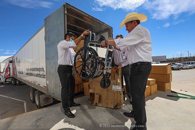 Al recibir los insumos en el municipio de Guadalupe, el Gobernador constató que se trata de kits para cirugía, batas, guantes, equipo de protección para personal de salud, mesas de exploración, camas, sillas, aparatos ortopédicos, ultrasonidos, rayos x, bastones, vendas, agujas y andaderas, por mencionar algunos.