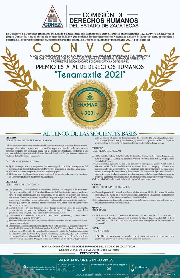 Zacatecas, Zac.- La Comisión de Derechos Humanos del Estado de Zacatecas (CDHEZ), con el objeto de reconocer la labor que realizan las personas físicas y morales a favor de la promoción, protección y defensa de los derechos humanos, convoca las Organizaciones de la Sociedad Civil, Colegios de Profesionistas y a la ciudadanía en general a participar en el Premio Estatal de Derechos Humanos “Tenamaxtle 2021”.