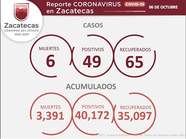 Zacatecas, Zac.- Este miércoles, la Secretaría de Salud de Zacatecas (SSZ) reportó 65 personas recuperadas del covid-19, así como 49 nuevos casos positivos y seis fallecimientos por el virus que ha causado la actual pandemia mundial.
