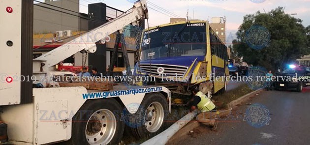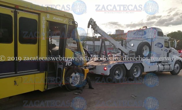 Guadalupe, Zac.- Seis personas lesionadas fue el saldo de un choque entre dos pesadas unidades la tarde-noche de este jueves en las inmediaciones del bulevar López Portillo cuando se impactaron una unidad de la ruta 16 marcado con el número económico 8 y una grúa de plataforma con logotipos de “Grúas Escobedo”.