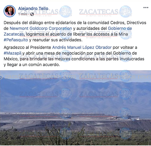 “Tras platicar con manifestantes, acordamos retomar las ofertas que ofrece Newmont Goldcorp, pero con la mina liberada, por lo que ya se encuentra desbloqueada totalmente”, informó Alejandro Tello.