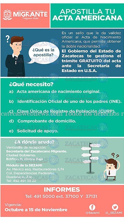 Publicado por ZACATECASWEBNEWS en octubre - 7 - 2019 Comentarios desactivados en OFRECE SEZAMI TRÁMITE DE APOSTILLE DE ACTAS AMERICANAS