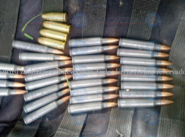 Al retornar y verificar el contenido de la mochila, en su interior se localizó un chaleco táctico color negro, dos cargadores para arma corta, uno con tres cartuchos útiles calibre 38 milímetros y otro con un cartucho útil 9 milímetros, además de un cartucho calibre 7.62×39 y 29 cartuchos útiles .223, los cuales fueron asegurados para ser puestos a disposición del Ministerio Público.