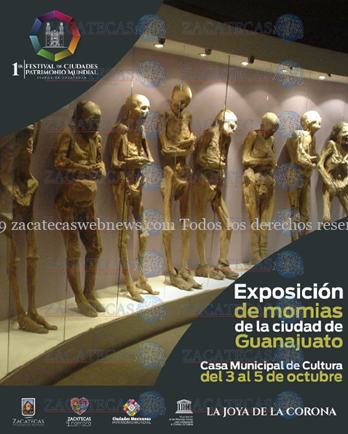 Detalló que del 3 al 5 de octubre la Casa Municipal de Cultura de la Capital albergará a Montserrat, Agrado, Lulú, Eduardo, Minero 1 y Simón Lozano, seis momias trasladadas a Zacatecas y que dan muestra de los atractivos más representativos de la ciudad patrimonio de Guanajuato.