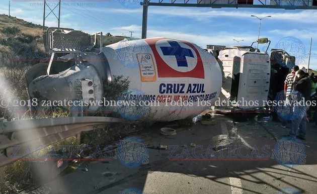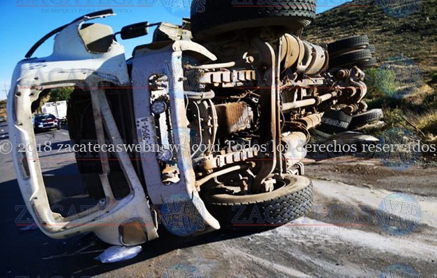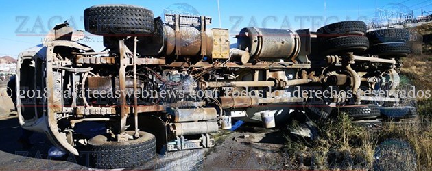 Zacatecas, Zac.- Sobre tránsito pesado ocurrió un accidente tipo volcadura cuando un tractocamión conocidos como “Trompo”, se volcó sobre la carpeta asfáltica resultado el conductor con algunas heridas por lo que fue trasladado para su valoración a un hospital, mismo que las autoridades lo reportan fuera de peligro.