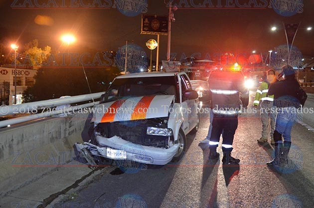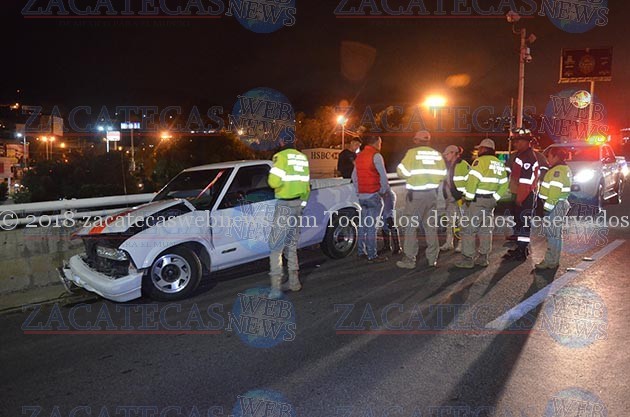 Zacatecas, Zac. Ebrio conductor de 23 años de edad, perdió el control de la unidad en que viajaba con las características de una camioneta Chevrolet s 10 impactando contra una barrera lateral sobre el puente vehicular ubicado frente a Soriana con dirección a Guadalupe.