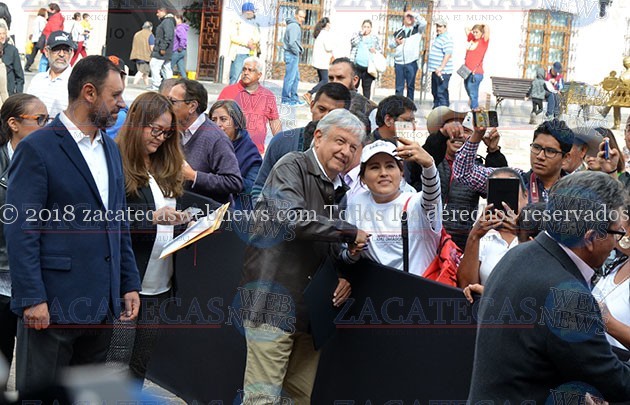 Asimismo, reiteró a los zacatecanos su apoyo y respaldo, donde reafirmó los compromisos que hizo en campaña. El próximo Presidente de la República aseguró que se les cumplirá a los ex braceros, garantizó que habrá señal de internet en todo el Estado, que se acabarán los intermediarios para programas sociales y reiteró el apoyo a las comunidades mineras de la entidad.