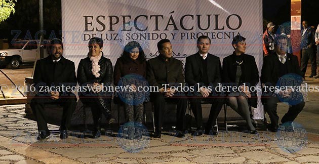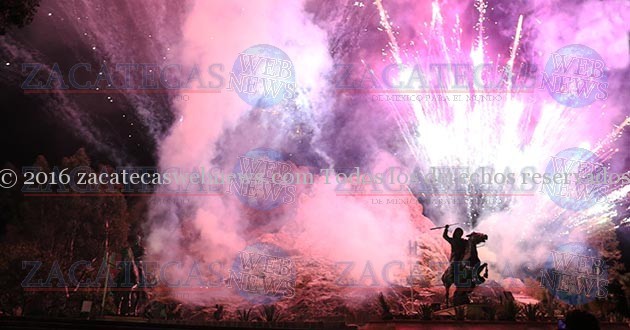 El espectáculo de luz fue alternado con el relato de un pasaje de la historia de Zacatecas, para luego dar paso a la quema de fuegos pirotécnicos, que explotaron en derroche de colores y figuras en el negro cielo nocturno.
