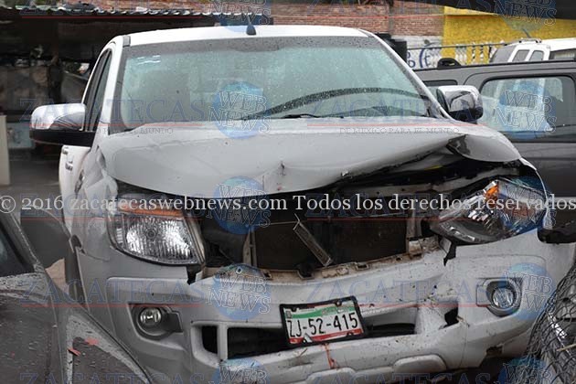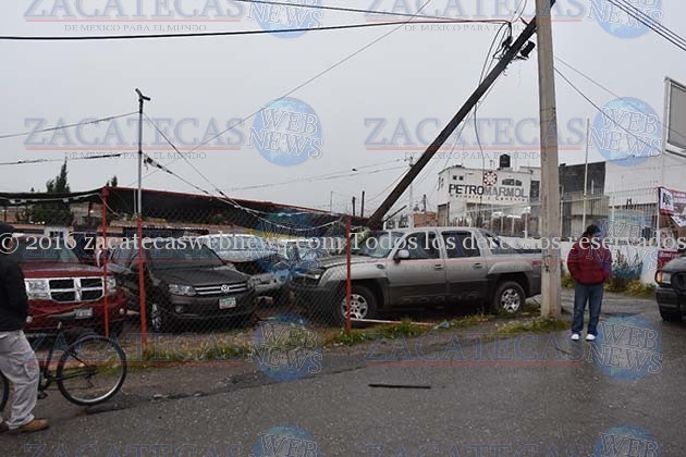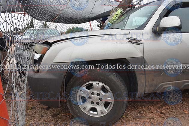 Guadalupe, Zac.- El conductor de  una camioneta perdió el control de la unidad presuntamente debido al exceso de velocidad con la que conducía para impactar contra un poste propiedad de Telmex, además chocar contra dos vehículos que se encontraban en el interior de un Lote de autos usados, afortunadamente sólo se registran daños materiales.