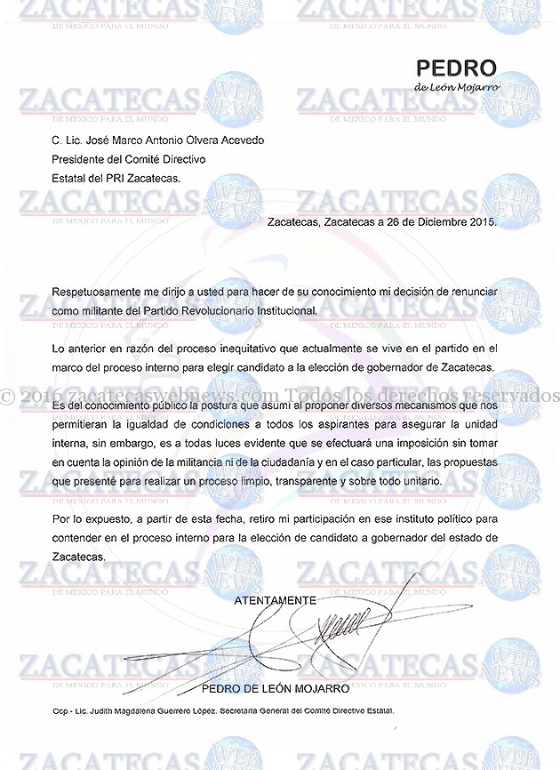 Zacatecas, Zac.- en una carta enviada el ex aspirante a ocupar la primera magistratura del estado pedro de León señala lo siguiente.