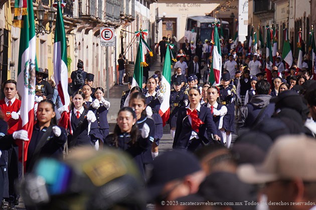 Luego de entregarse los premios de la Carrera por la Paz a alumnos del Bachillerato General Militarizado y ascensos a elementos de la Secretaría de la Defensa Nacional (Sedena), se abrió paso a los distintos contingentes de este emotivo y tradicional desfile cívico-educativo, que recorrió las calles del Centro Histórico de Zacatecas, con la participación de más de 3 mil personas, entre estudiantes, docentes y grupos folclóricos.