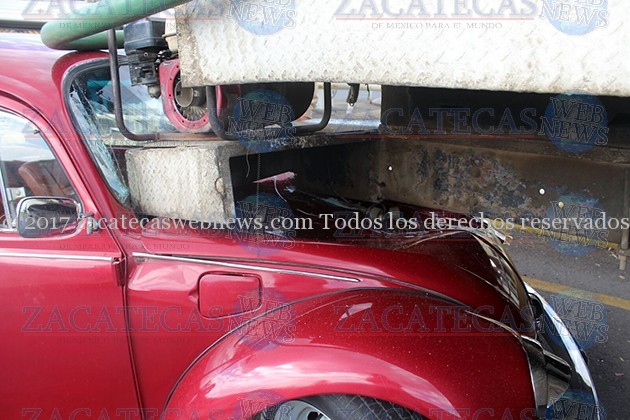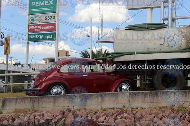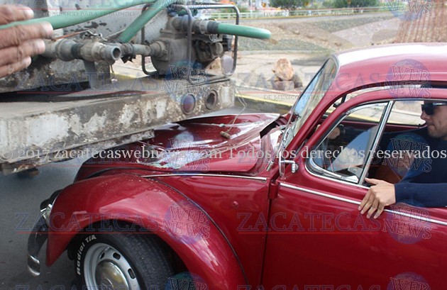 Zacatecas, Zac.- Un auto Volkswagen tripulado por algunos jóvenes estudiantes, quedo debajo de una pipa que abastecía un autolavado ubicado a un costado del puente vehicular de los conos camino a Guadalupe.