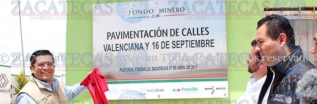 La obra realizada en Plateros, esto es, la construcción de pavimento, banquetas y guarniciones de estas calles, representó una inversión de un millón 665 mil 413 pesos proveniente del Fondo para el Desarrollo Regional Sustentable de Municipios Mineros (Fondo Minero) con la que se busca beneficiar a casi 500 habitantes de esta comunidad.