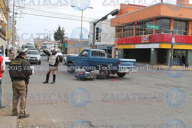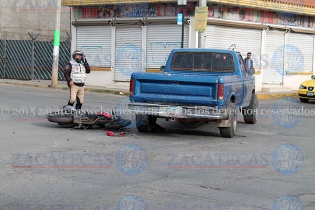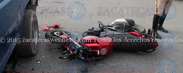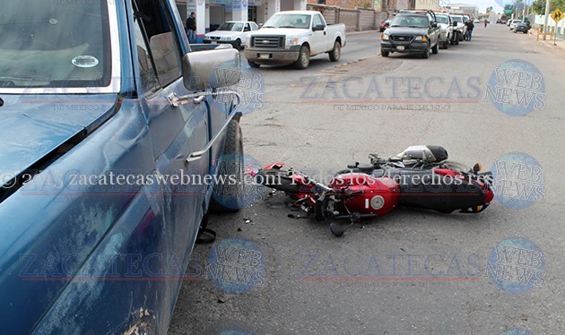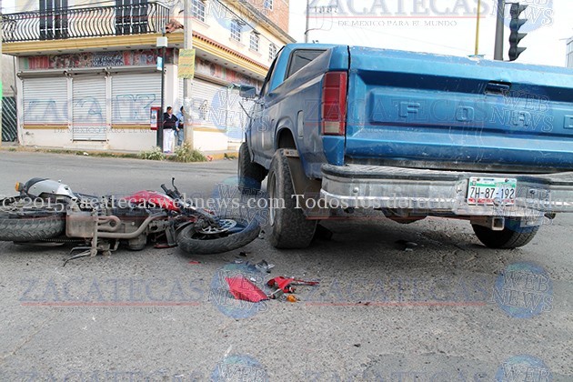 Guadalupe, Zac.- Al pretender ganarle el paso a una Pic-up, una femenina que tripulaba una motocicleta Yamaha Fz 150 cc. Protagonizó un fuerte impacto contra la caja de la camioneta, el mismo que arrojo considerable daño material, sobre todo en la motocicleta, aunado el tipo de lesiones de la mujer.